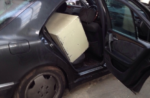 Angefügt erhalten Sie ein Foto des sichergestellten Pkw mitsamt Tresor. Aufnahmeort ist das Sicherstellungsgelände der Polizei.