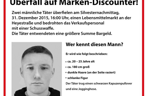 POL-D: Bewaffneter Raub am Silvesternachmittag - Lebensmitteldiscounter überfallen - Polizei fahndet mit Plakat und Phantombild - Wer kennt den Mann?