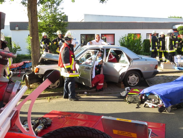 Um 18.58 Uhr rückten die Einsatzkräfte der Feuerwehr am Dienstagabend zu einem Verkehrsunfall zum Bonifaciusring in Essen-Kray aus. In dem dortigen Gewerbegebiet kam ein Mercedes-Benz aus bisher unbekannter Ursache von der Fahrbahn ab und prallte dort gegen einen Baum und wurde dadurch schwer beschädigt. Der 86 Jahre alte Fahrer und seine 79-jährige Begleiterin wurden bei dem Unfall schwer verletzt. An dem Unfall waren sonst keine weiteren Fahrzeuge beteiligt. Durch den Aufprall wurde die Limousine so stark beschädigt, dass der Fahrer und die Beifahrerin mit hydraulischem Rettungsgerät der Feuerwehr befreit werden mussten umso eine patientenschonende Rettung zu ermöglichen. Während der technischen Rettung wurden die beiden Insassen parallel durch das anwesende Rettungsdienstpersonal versorgt. Der Fahrer und die Beifahrerin wurden unter notärztlicher Behandlung in zuständige Krankenhäuser transportiert. Die Straße blieb während der Rettungsarbeiten und für die anschließende Unfallaufnahme für die Dauer von ca. zwei Stunden in beide Fahrtrichtungen gesperrt. Der Mercedes Benz Typ 190 E wurde nach der Rettung und der Unfallaufnahme durch einen Abschleppdienst zur Sicherstellung transportiert. Da die Unfallursache unklar war hat die Polizei die Ermittlungen diesbezüglich aufgenommen. (BW)