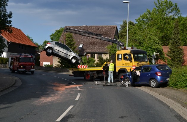 Bad Salzdetfurh/ Heinde (web) - Am Samstag (30.05.15), gegen 17:30 Uhr, kam es in der Ortsdruchfahrt Heinde - Hauptstraße - zu einem folgenschweren Verkehrsunfall. Zum Unfallzeitpunkt befuhr eine 26jährige aus der Gemeinde Giesen mit ihrem PKW Peugeot die Hauptstraße in Heinde aus Rtg. BAB 7 kommend in Rtg. Groß Düngen. Zeitgleich befuhr eine 35jährige aus der Gemeinde Schellerten mit ihrem Pkw Dacia die Hauptstraße aus Rtg. Gr. Düngen kommend in Rtg. BAB 7. Im Verlaufe einer scharfen Kurve (Höhe Mühlenweg) geriet die Giesenerin auf der leicht feuchten Fahrbahn mit ihrem Pkw in den Gegenverkehr und prallte dort mit dem Pkw der Schellerterin zusammen. Beide Fahrzeuge wurden durch den Zusammenprall schwer beschädigt und blockierten fortan die Ortsdurchfahrt. Weiterhin wurden die Giesenerin und die 4jährige Tochter der Schellerterin bei dem Verkehrsunfall verletzt. Beide wurden mit Rettungswagen in Hildesheimer Krankenhäuser gebracht. Die Verletzungen scheinen aber zumindest nicht schwerwiegend zu sein. Zur Unfallaufnahme und Bergung der Fahrzeuge war die Hauptstraße im Bereich der Unfallstelle für rund eine Stunde vollgesperrt. Der Verkehr wurde abgeleitet. Es kam nur zu geringen Verkehrsbehinderungen. Die beiden stark beschädigten Pkw wurden abgeschleppt - verm. jeweils wirtschaftl. Totalschaden -. Die Schadenssumme wird dabei auf mindestens 10.000 Euro geschätzt. Um augelaufende Betriebsstoffe zu binden und aufzunehmen kam auch die Freiwillige Feuerwehr Heinde zum Einsatz.