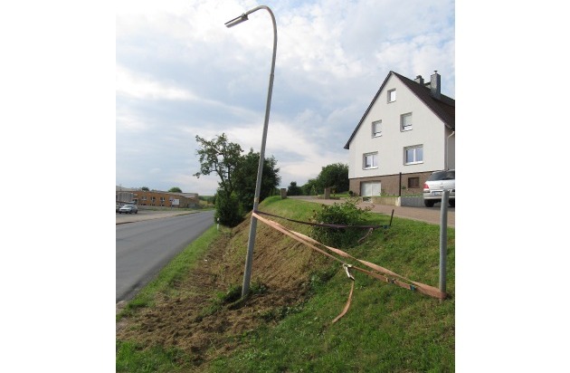 Am 30.06.17, 17:05 Uhr, wurde der Polizei Alfeld eine "erheblich" schräg stehende Straßenlaterne in Freden/Leine, Herrenkamp, gemeldet. Die Laterne hatte im aufgeweichten Untergrund ihren Halt verloren und neigte sich nun deutlich in Richtung Fahrbahn. Die anfangs angebotene Hilfe eines Pkw-Fahrers hatte die Polizei noch "ausgeschlagen", bis sich kurz darauf die Laterne durch die Erschütterung passierender Fahrzeuge weiter neigte und auf die Straße zu stürzen drohte.