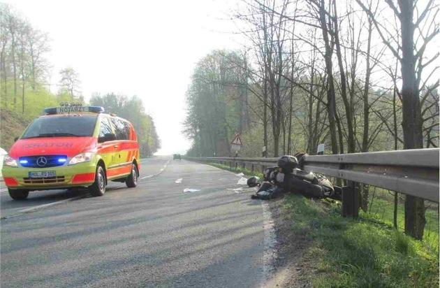 Mit schweren Verletzungen musste am gestrigen Donnerstagnachmittag ein 59jähriger Kradfahrer mit dem Rettungshubschrauber in das Nordstadt-Krankenhaus in Hannover geflogen werden. Er war in der Gemarkung Eschershausen auf der Bundesstraße 64 mit seiner Maschine nach einem Überholvorgang nach rechts von der Fahrbahn abgekommen und seitlich gegen die Schutzplanke geraten. Sein 17jähriger Soziusfahrer wurde leicht verletzt und wurde mit dem Rettungswagen zur Untersuchung ins Holzmindener Krankenhaus eingeliefert. Gegen 17:00 Uhr befuhr der Mann aus Hannover mit seiner BMW K 1300 S die B 64 aus Eschershausen kommend in Richtung Negenborn. Nach erfolgtem Überholvorgang in einer Linkskurve kam der 59jährige mit seinem 17jährigen Beifahrer nach rechts von der Fahrbahn ab und prallte gegen die Schutzplanke rechts der Fahrbahn. Während der Fahrer schwer verletzt wurde, kam der 17jährige Soziusfahrer aus Isernhagen mit Prellungen davon. Am Krad entstand erheblicher Sachschaden (5.000,-- EUR).