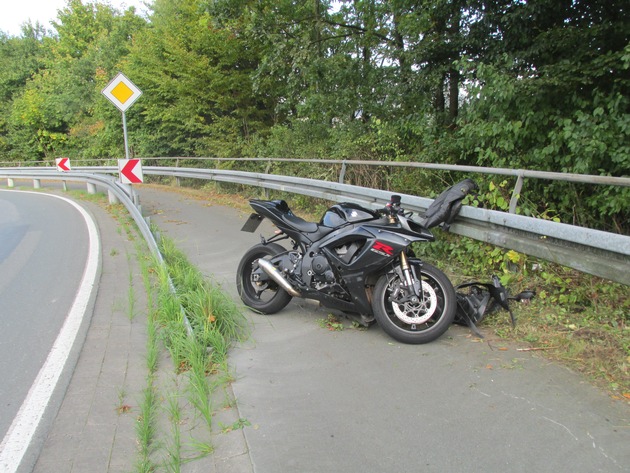 Am Samstag, dem 03.10.2015, kam es gegen 17.15 Uhr, am Hagener Berg zu einem Motorradunfall. Der 21-jährige Fahrer einer Suzuki wollte talwärts eine Linkskurve durchfahren. Vermutlich aufgrund nicht angepasster Geschwindigkeit stürzte er mit seiner Maschine und prallte gegen die Leitplanke. Er war allein an dem Unfall beteiligt und überstand den Sturz unverletzt. An seiner Maschine entstand erheblicher Sachschaden.