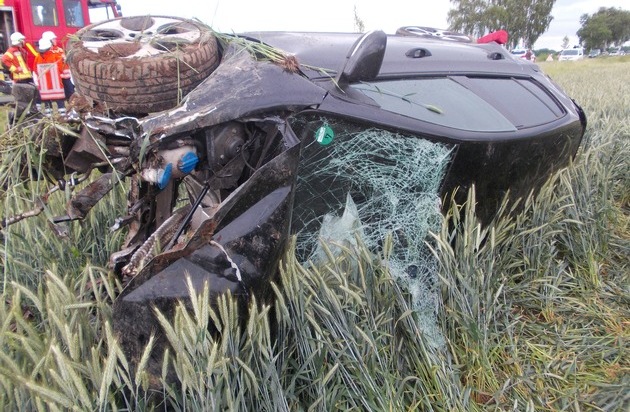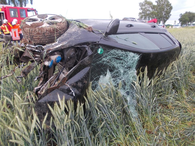 Landesbergen (scho) Am gestrigen Abend gegen 18.50 Uhr wollte ein 42jähriger Pkw-Fahrer als alleiniger Fahrzeuginsasse auf der Kreisstraße 8 von Landesbergen kommend drei in Richtung Brokeloh fahrende Pkw überholen. Gleich zu Beginn des Überholvorgangs touchierte sein Fahrzeug den in letzter Position der Kolonne fahrenden Pkw. Anschließend verlor der Überholende die Kontrolle über sein Fahrzeug, geriet nach links mit einem Rad auf den dortigen Grünstreifen, kam auf die Fahrbahn zurück, überholte den in der Mitte der Kolonne fahrenden Pkw und geriet anschließend vor diesem nach rechts von der Fahrbahn. Dort geriet er in einen Böschungsgraben, "befuhr" diesen über eine längere Strecke und prallte gegen eine Brückenböschung. Durch diesen Aufprall hob das Fahrzeug ab, "flog" eine längere Strecke und überschlug sich mehrfach. Hierbei wurde der Fahrzeugführer aus dem Pkw geschleudert.