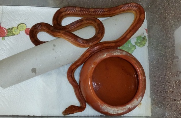 NORTHEIM (fal) - Auf einem Grundstück am Northeimer Burgweg (Stichstraße hinter dem Finanzamt) fand eine Anwohnerin am 20.12.2014 eine quicklebendige Schlange. Bei der etwa einen Meter langen Schlange handelt es sich nach Expertenauskunft um eine ungiftige nordamerikanische Kornnatter. Das vermutlich aus einem Terrarium entwichene Kriechtier wurde eingefangen und in der Schlangenfarm in Schladen artgerecht untergebracht.