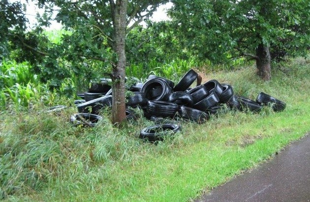 In den vergangenen Tagen in der Zeit vom Mi, 29.7.15, bis Do, 30.7.15, entsorgte man im Bereich Prinzenhof in Freienwill in einer Sackgasse etwa 40 Altreifen. Beamte der Polizeistation Husby leiteten ein Ermittlungsverfahren wegen Verstoßes gegen umweltrechtliche Bestimmungen ein. Der Fundort befindet sich unweit eines Abfallwirtschaftshofes in Flensburg, wo die Reifen ordnungsgemäß hätten entsorgt werden können. Verantwortlicher, Zeugen und Hinweisgeber melden sich bitte unter 04634/939798-0 bei der Polizei in Husby.