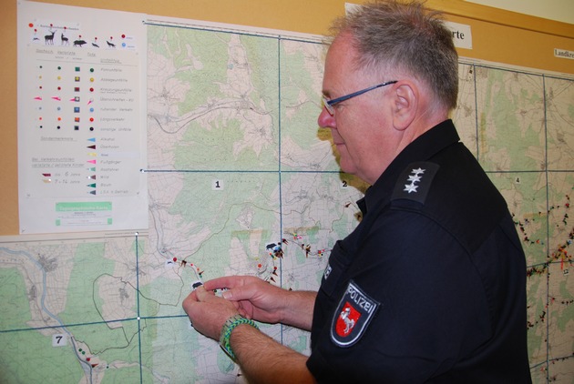 Sämtliche Daten fließen schließlich zentral im Sachbereich Verkehr der PI Göttingen zusammen. Hier erfolgt die manuelle Eintragung in einer eigenen Unfalltypensteckkarte (siehe Foto). Auch das ist neu. Bislang wurden Wildunfälle immer zusammen mit allen anderen Unfallarten erfasst. Seit 2011 geschah dies in der neu eingeführten Elektronischen Unfalltypensteckkarte (EUSKA). Dieses Vorgehen wird nun für die Dauer des Projektes ausgesetzt.