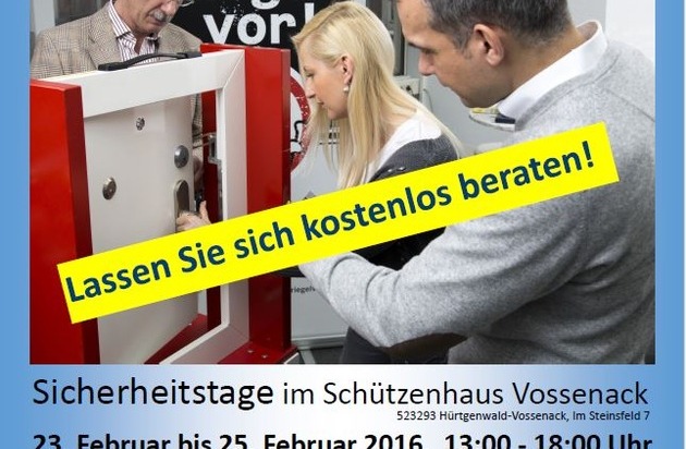 Im Zeitraum von Dienstag, dem 23. Februar 2016, bis Donnerstag, dem 25. Februar 2016, jeweils von 13:00 Uhr bis 18:00 Uhr finden unter der Leitung des Technischen Fachberaters des Kriminalkommissariats für Kriminalprävention und Opferschutz, Herr Kriminalhauptkommissar Dietmar Schorn, die Sicherheitstage statt. Handwerker aus der Region, die sogenannten Netzwerkpartner der Schutzgemeinschaft Rureifel, werden die Veranstaltung begleiten, Exponate bereit halten und ausführlich über technische Möglichkeiten unverbindlich informieren.