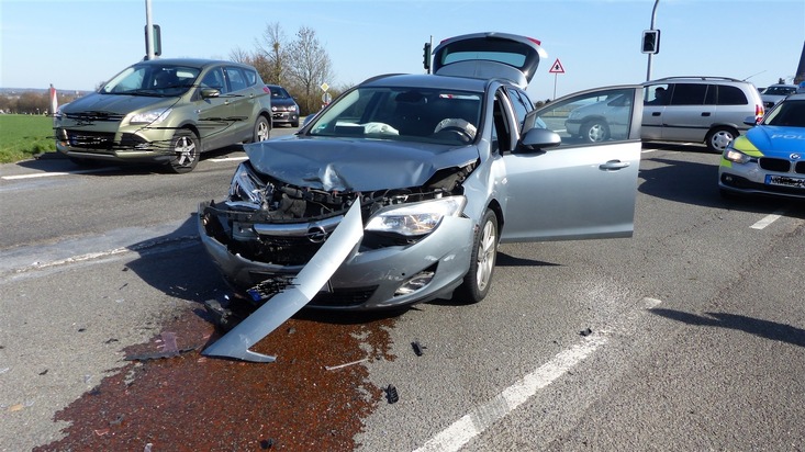 Am 06.04.2018, gegen 16.05 Uhr, befuhr eine 22-jährige Frau aus Düren mit ihrem PKW die Kreisstraße 28 von Drove in Richtung Bundesstraße 56 Ortslage Soller. An der Kreuzung K 28/ B 56 beabsichtigte sie, nach links in Richtung Düren abzubiegen. Dabei erkannte sie einen entgegenkommenden PKW zu spät und beachtete nicht den Vorrang, des 32-jährigen Fahrzeugführers aus Kreuzau. In der Mitte des Kreuzungsbereiches kam es zum Zusammenstoß, bei dem beide Führer und zwei Mitfahrerinnen (19 und 47 Jahre alt) im PKW der Dürenerin leicht verletzt wurden. Zum Glück verhinderten die ausgelösten Airbags in einem Fahrzeug schlimmere Verletzungen. Die Verletzten wurden mit vier Rettungswagen in die umliegenden Krankenhäuser gebracht. Die beiden Fahrzeuge waren nicht mehr fahrbereit und wurden auf eigenen Wunsch der Fahrer abgeschleppt. Die Kreuzung musste während der Unfallaufnahme und zur Bergung der Pkw zeitweise gesperrt werden. Es entstand ein Sachschaden von geschätzt 12000 Euro.