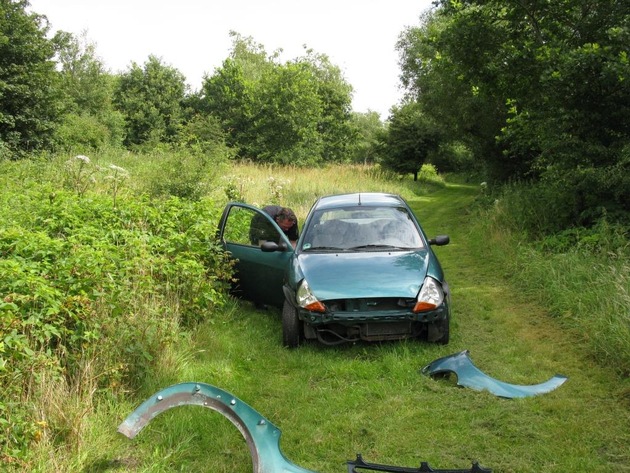 Montagmorgen, 03.08.15, fand eine Spaziergängerin in einem Forstweg in der Eckernförder Landstraße / Ecke Jarplunder Weg (am Regenrückhaltebecken) bei Flensburg den gesuchten Unfallwagen.
