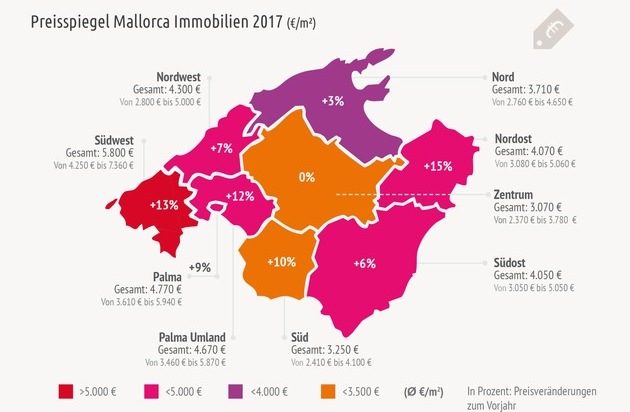 Die im letzten Jahr deutlich gestiegene Nachfrage nach Mallorca Immobilien wirkt sich 2017 inselweit auf das Preisniveau aus. Die größte Steigerungsrate verzeichnen die Analysten mit 15% in der Region Nordost, hier stiegt der durchschnittliche Quadratmeterpreis von 3.530,- EUR im Vorjahr auf 4.070,- EUR in 2017.