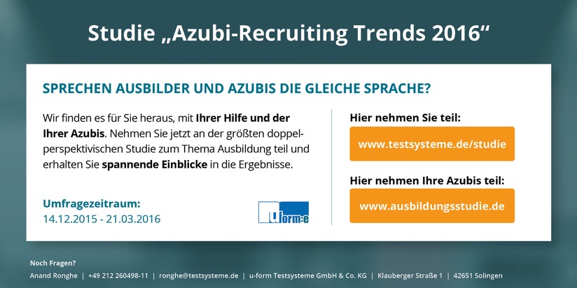 Eine bundesweite Online-Befragung von Ausbildungsverantwortlichen und (angehenden) Azubis zum Thema Azubi-Marketing und -Recruiting hat heute der Solinger Ausbildungsspezialist u-form Testsysteme gestartet. Ausbildungsverantwortliche nehmen unter www.testsysteme.de/studie an der Studie teil, Azubis und Schüler unter www.ausbildungsstudie.de.