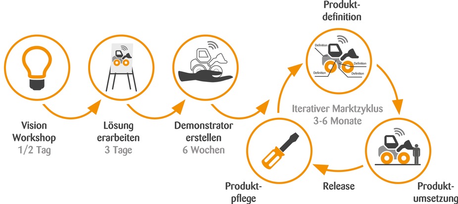 Der Industrie 4.0 Accelerator umfasst einen klar definierten Projektablauf, nutzt etablierte Standards und die Zühlke IoT Platform. Sehr schnelle Entwicklungszeiten von 3 - 6 Monaten für Industrie 4.0-Projekte werden so möglich. Darüber hinaus sichern die Ingenieure, Business Analysten und Innovationsexperten von Zühlke ihren Kunden zu, innerhalb von 6 Wochen einen voll funktionsfähigen Prototyp zu realisieren. Dieser kann dann im Produktmanagement und auf Kundenterminen eingesetzt werden, um über die Produkte von morgen zu sprechen.