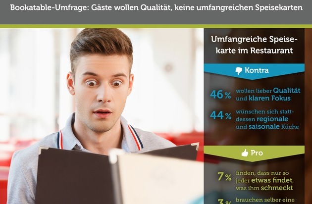 "Slow Food, regionale Küche und bewusste Ernährung sind Themen, die sich mittlerweile auch in unserem Verhalten beim Essengehen widerspiegeln", sagt Thomas Bergmann, Sales Director bei Bookatable. "Will man seinen Kunden Qualität und nachhaltige Produkte anbieten, dann ist das als Generalist mit umfangreicher Speisekarte kaum machbar. Denn alle nötigen Lebensmittel frisch einzukaufen ist teuer und vieles landet dann eben zwangsläufig ungenutzt im Müll. Oder Restaurants müssen auf Fertigprodukte setzen - zu Lasten der Qualität. Das wissen mittlerweile auch die Gäste und suchen sich bewusst Alternativen."