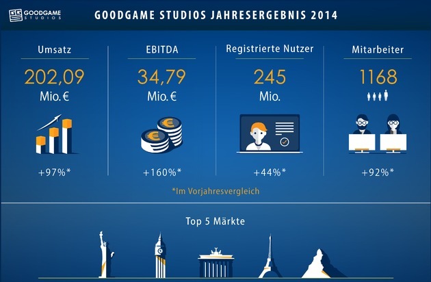 - Fokus 2015 liegt auf der Entwicklung neuer SpieleGoodgame Studios, Deutschlands führender Entwickler und Anbieter von Spielesoftware, veröffentlicht heute die Geschäftszahlen für das Gesamtjahr 2014. Das unter der rechtlichen Einheit Altigi GmbH firmierende Unternehmen erwirtschaftete demnach im Gesamtjahr 2014 einen Umsatz von 202,09 Millionen Euro. Im Vorjahresvergleich hat Goodgame Studios den Umsatz von damals 102,62 Millionen Euro um 97 Prozent knapp verdoppelt.