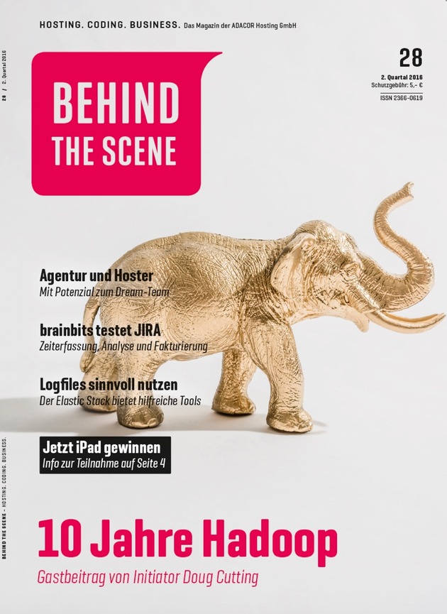 Ausgabe 28 des Kundenmagazins Behind The Scene (BTS) von ADACOR Hosting feiert den zehnten Geburtstag von Hadoop und klärt offene Fragen: Was sind disruptive Innovationen? Wie werden Dream-Teams gebildet? Und wie sieht Projektmanagement nach Scrum aus? Jetzt kostenlos downloaden unter http://bit.ly/bts28-download