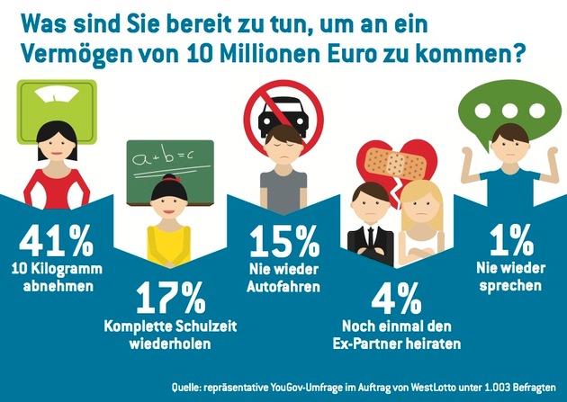 Axel Weber, Sprecher von WestLotto, erläutert: "Wir wollten wissen, was die Deutschen für ein großes Vermögen in Millionenhöhe bereit wären zu tun. Auffällig ist, dass die wenigsten für diese enorme Summe auf etwas verzichten würden. Und das, obwohl gleichzeitig fast alle Bundesbürger gern Multimillionär wären."