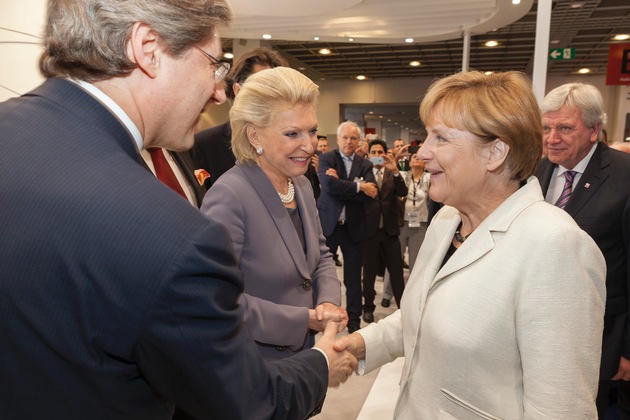 Bundeskanzlerin Angela Merkel begrüßte Maria-Elisabeth Schaeffler-Thumann, Gesellschafterin der Schaeffler AG, auf dem Schaeffler-Messestand auf der IAA in Halle 5.1. Gemeinsam mit Gesellschafter Georg F. W. Schaeffler, Klaus Rosenfeld, Vorstandsvorsitzender der Schaeffler AG, und Jürgen Thumann begleitete sie die Kanzlerin ein Stück auf ihrem offiziellen Messerundgang.