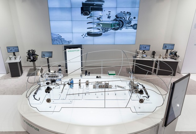 Anschaulich gemacht werden die Schaeffler-Innovationen unter anderem in einem "Glass Car", einem Exponat, das rund 40 Produkte und Technologien bündelt. Ergänzt wird das Modell von beweglichen Bildschirmen, die als Röntgenscanner fungieren und entlang des Fahrzeuges die Komponenten des Antriebsstrangs erklären.