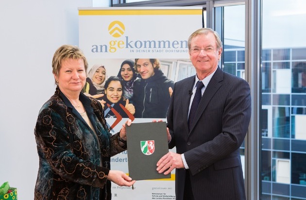 In Dortmund startet ein innovatives Integrationsprogramm für junge Flüchtlinge und Zugewanderte: "Angekommen in deiner Stadt Dortmund". In Vertretung für Schulministerin Sylvia Löhrmann haben Ludwig Hecke, Staatssekretär im Ministerium für Schule und Weiterbildung, sowie der Dortmunder Oberbürgermeister Ullrich Sierau und Prof. Dr. Gunter Thielen, Vorstandsvorsitzender der Walter Blüchert Stiftung, den Kooperationsvertrag für das Gemeinschaftsprojekt unterzeichnet. Mit dem Programm "angekommen" wird ein passgenaues Bildungsangebot für die Zielgruppe der 16- bis 25-jährigen Jugendlichen aufgebaut und in Dortmund etabliert. Das Zwei-Säulen-Konzept der Stiftung umfasst die individuelle Förderung für einen schnellen Schulabschluss einschließlich Start in eine Berufsausbildung in einem durchlässigen System - bei gleichzeitiger Betreuung und Begleitung auch nach dem Unterricht, an den Wochenenden und in den Ferien, damit Integration gelingen kann.