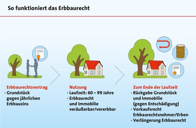Das Erbbaurecht wird im Grundbuch eingetragen und kann ebenso wie die auf dem Grundstück stehende Immobilie verkauft oder vererbt werden. Für das Erbbaurecht wird ein jährlicher Erbbauzins fällig, der im Schnitt bei drei bis vier Prozent des Grundstückwertes liegt und während der Laufzeit angepasst wird. Für das eingangs erwähnte 400-Quadratmeter-Grundstück ergibt sich somit eine jährliche Belastung von etwa 5.700 Euro. Die Immobilie selbst kann über eine klassische Baufinanzierung mit Bausparvertrag finanziert werden. "Das Erbbaurecht kann gerade in Regionen mit hohen Grundstückspreisen eine Alternative zum Kauf sein", sagt Sven Schüler. "Schließlich bringt der geringere Kapitalbedarf Vorteile bei der Finanzierung."