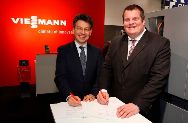 Auf der BAU 2015 unterzeichneten Dr. Frank Voßloh, Geschäftsführer Viessmann Deutschland, und Dr. Uwe Kolks, Geschäftsführer E.ON Energie Deutschland, die Kooperationsvereinbarung zwischen den beiden Unternehmen. "Mit Viessmann verbindet uns seit vielen Jahren eine enge Partnerschaft", bestätigt Uwe Kolks bei der Vertragsunterzeichnung. "An der Brennstoffzellen-Technologie arbeiten Viessmann, aber auch E.ON bereits seit längerem. Die hohe Effizienz der Anlagen kann einen erheblichen Beitrag zum Klimaschutz leisten. Die Kombination mit Bio-Erdgas als Energieträger wäre dann eine perfekte Ergänzung für den Klimaschutz. Daher setzen wir uns für die Einführung von Brennstoffzellen-Heizgeräten ein und fördern deren Markteintritt finanziell", so Kolks weiter.