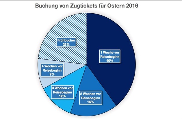 Mehr als die Hälfte (56 Prozent) aller fromAtoB-Kunden, die im Jahr 2016 ein Zugticket für das Osterwochenende gebucht haben, taten dies innerhalb der letzten 14 Tage vor Reiseantritt, sogar 40 Prozent in der letzten Woche. "Auf Basis unserer Analysen empfehlen wir allen Reisenden, mit der Buchung von Zugtickets für Ostern 2017 nicht mehr zu warten", sagt fromAtoB-Geschäftsführer Gunnar Berning. "Günstige Tickets sind meist kontingentiert, d.h. es gibt für bestimmte Strecken nur eine begrenzte Anzahl davon. Daher sind beispielsweise Sparpreis- und Aktionsangebote der Deutschen Bahn jetzt schon fast vergriffen. Ähnliche Muster haben wir auch für Flug- und Fernbusangebote im Osterzeitraum feststellen können."