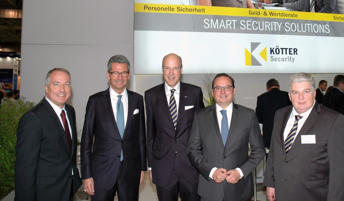 Hohen Besuch gab es zum Auftakt der weltgrößten Sicherheitsmesse "security 2016", die heute in der Messe Essen gestartet ist, bei KÖTTER Security: Ulrich Grillo, Präsident des Bundesverbandes der Deutschen Industrie (BDI) und Thomas Kufen, Oberbürgermeister der Stadt Essen, informierten sich im Rahmen ihres Messerundgangs u. a. über Dienstleistungs- und Produktneuheiten des Familienunternehmens. Sie wurden am Stand von KÖTTER Security durch Friedrich P. Kötter, u. a. Verwaltungsrat der Westdeutscher Wach- und Schutzdienst Fritz Kötter SE & Co. KG und Vize-Präsident des Bundesverbandes der Sicherheitswirtschaft (BDSW), begrüßt. Der zweitgrößte Sicherheitsdienstleister Deutschlands, der seit dem 1974 erfolgten Start der "security" kontinuierlich auf dem wichtigsten Branchentreff vertreten ist, stellt bis kommenden Freitag, 30. September, in Halle 2.0, Stand 2A40 z. B. folgende Neuheiten und Angebote vor: