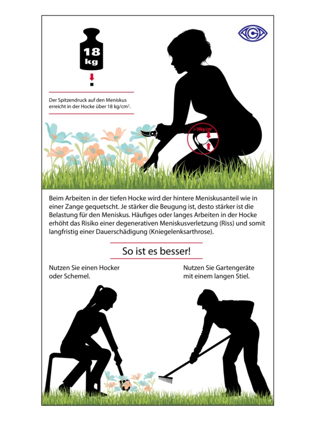 Hockende Tätigkeiten, wie sie bei der Gartenarbeit zum Pflanzen, Schneiden oder Unkraut zupfen nötig sind, belasten unsere Gelenke, insbesondere das Knie. In der Hocke entsteht eine vermehrte Druckwirkung auf das Kniegelenk. In der äußersten Beu-gehaltung werden die hinteren Meniskusanteile im Kniegelenk regelrecht gequetscht. Verharrt man lange in der gebeugten Position wird außerdem die Oberschenkelmuskulatur maximal gedehnt und es entsteht ein hoher Druck im Gleitlager der Kniescheibe. Ist das Knie aufgrund einer Verletzung oder einer Arthrose schon geschädigt, gilt es besonders gut aufzupassen und eine Überbelastung zu vermeiden.