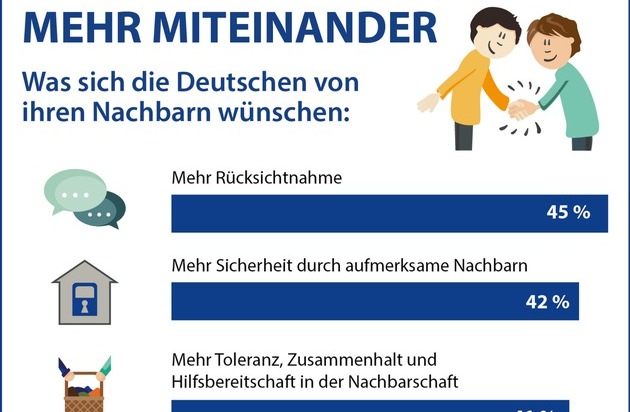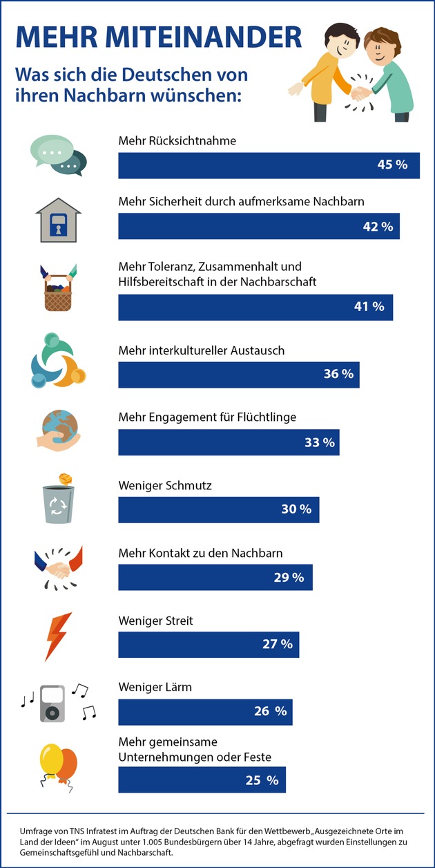 Mehr Rücksicht bitte, liebe Nachbarn! Das wünschen sich 45 Prozent der Deutschen. Und gern die Wohnung oder das Haus nebenan noch besser im Blick behalten, damit sich die Nachbarn sicherer fühlen. Darüber würden sich 42 Prozent der Bundesbürger freuen, so das Ergebnis einer repräsentativen Umfrage [1] im Auftrag der Deutschen Bank und der Initiative "Deutschland - Land der Ideen". Was fehlt noch zur idealen Nachbarschaft? Mehr Toleranz und Hilfsbereitschaft (41 Prozent) - und weniger Streit (27 Prozent) und Lärm (26 Prozent). Jeder Vierte (25 Prozent), der anlässlich des Wettbewerbs "Ausgezeichnete Orte im Land der Ideen" befragt wurde, wünscht sich zudem mehr gemeinsame Unternehmungen oder Feste mit seinen Nachbarn - für mehr Zusammenhalt im Stadtteil.