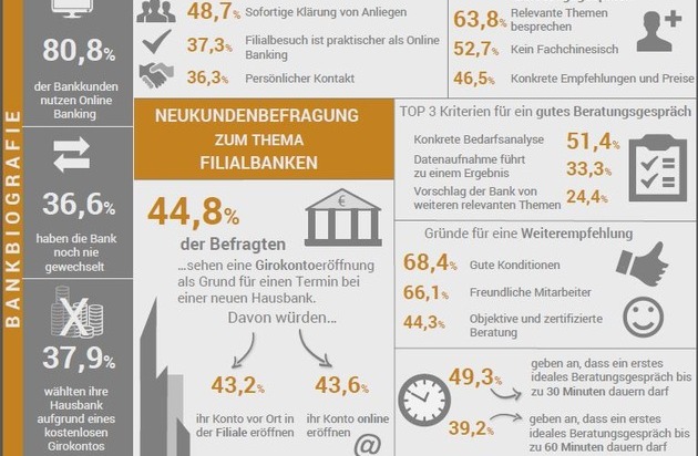Umfrage: Multikanal-Banking und gute Konditionen sind gefragt Häufig können Filialbanken bereits mit einfachen Maßnahmen potenzielle Kunden und Bestandskunden zufriedenstellen - etwa mit schnellen Reaktionszeiten und einem überschaubaren Zeitfenster für die Beratung.