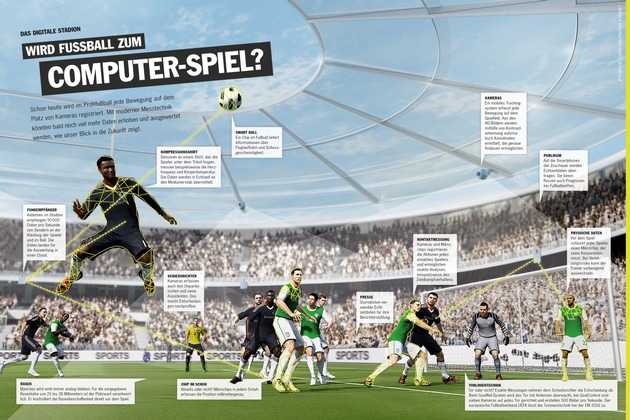 Technisch muss beim Fußball so gut wie nichts mehr dem Zufall überlassen bleiben. Millionen von Daten werden erfasst und fließen in Echtzeit in Analysen über Spiel, Spieler und Schiedsrichter - und sie werden immer wichtiger für die Aufstellung, die richtige Taktik und den Transfermarkt. Mikrochips am Sportler und jede Menge Digitaltechnik machen es möglich. Die Managementberatung Porsche Consulting hat zusammengestellt, was sich im Stadion schon bald ändern kann.