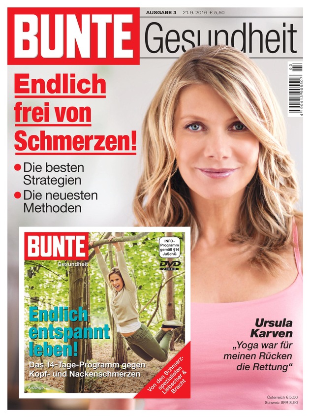 Nach zwei erfolgreichen Ausgaben (#1 Rücken; #2 Haut) folgt am 21. September das dritte Sonderheft aus der Reihe Bunte Gesundheit. Diesmal steht das Thema "Schmerz" im Fokus der Berichterstattung. Das Heft bietet fundierte Gesundheitsberichte und viele praxisbezogene Themen mit der für Bunte typischen Nähe zu Prominenten. Ursula Karven ziert das Cover - sie erzählt im Interview, warum Yoga ihre Rettung war.