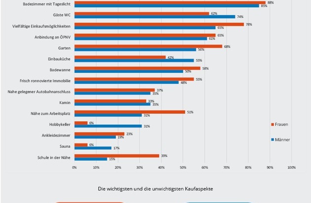 Wenig Wert legen Frauen auf einen Hobbykeller und eine eigene Sauna. Jeweils nur 6 Prozent der Frauen bewerteten das Vorhandensein von Hobbykeller und Sauna als wichtig. Im Vergleich: Fast ein Drittel der Männer (31 Prozent) gaben an, dass ihnen ein Hobbykeller wichtig sei. Unwichtig ist den Männern dagegen, ob sich eine Schule in unmittelbarer Nähe befindet, nur 15 Prozent bewerten das als wichtig. Die Schule ist für Männer damit das unwichtigste Kaufkriterium, gefolgt von Sauna (17 Prozent) und Ankleidezimmer (19 Prozent). Ein Ankleidezimmer ist - allen Klischees zum Trotz - nur 23 Prozent der Frauen wichtig und nimmt im Ranking der unwichtigsten Aspekte auch bei Frauen Platz 3 ein.