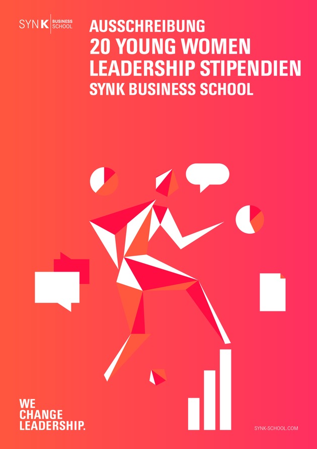 Weibliche Nachwuchsführungskräfte können sich jetzt für eine Intensiv-Leadership-Ausbildung gefördert durch ein Vollstipendium der SYNK Business School bewerben. Das YOUNG WOMEN LEADERSHIP Stipendienprogramm der SYNK Business School fördert 20 weibliche Nachwuchsführungskräfte zu Beginn ihrer Führungslaufbahn. Die YOUNG WOMEN LEADERS erhalten ein Stipendium für eine Intensiv-Leadership-Ausbildung im Wert von 5400,00 Euro. Die SYNK Business School legt damit erstmalig ein Programm im Gesamtwert von 108.000,00 Euro für die Förderung des weiblichen Führungsnachwuchses in Deutschland auf.