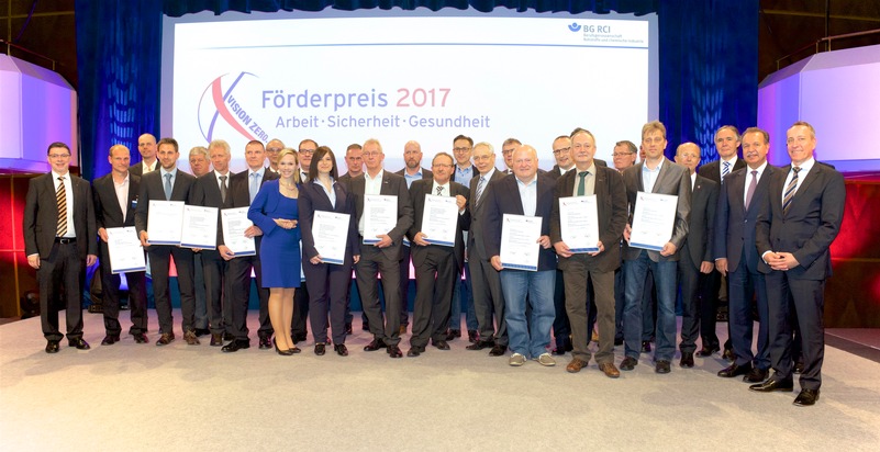 Der "Arbeitsschutz-Oscar" der Berufsgenossenschaft Rohstoffe und chemische Industrie (BG RCI) wurde in diesem Jahr zum 20. Mal verliehen. An dem Wettbewerb 2017 hatten sich deutschlandweit 603 Frauen und Männer mit 232 Beiträgen beteiligt. Für die besten Ideen für eine sichere Arbeitswelt erhielten 21 Preisträger und Preisträgerinnen aus sieben Unternehmen den BG RCI-Förderpreis Arbeit - Sicherheit - Gesundheit. Dieser wurde in sieben Kategorien verliehen. Die Förderpreise sind mit jeweils 10.000 Euro dotiert. Hinzukommen 14 Nominierungsprämien à 1.000 Euro.