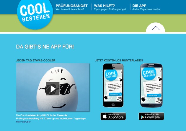 Eine neue App soll aufgeregte Schüler und Studenten bei ihren Prüfungsvorbereitungen unterstützen und ihnen helfen, ihre Angst in den Griff zu bekommen. Entwickelt wurde die "CoolBestehen" App von PASCOE Naturmedizin. Sie ist ab sofort im App Store (http://ots.de/ix9Tl) und bei Google Play (http://ots.de/hlEYS) verfügbar.