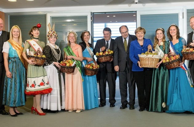 Hoher Besuch im Bundeskanzleramt: Apfelköniginnen aus sieben verschiedenen deutschen Anbaugebieten übergaben heute Bundeskanzlerin Angela Merkel und den Bundesministern der Bundesregierung bunte Apfelkörbe. Diese waren prall gefüllt mit frisch gepflückten Apfeldelikatessen von heimischen Obstbauern.