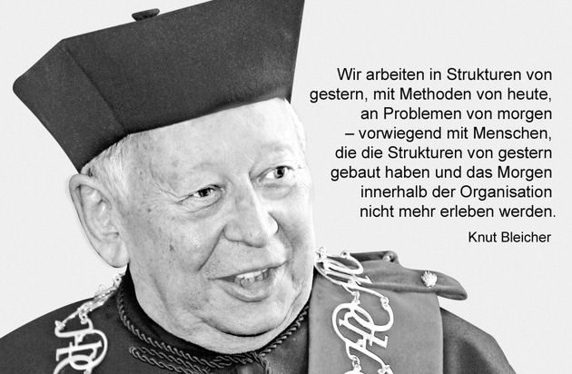 St. Gallen, August 2017 - Prof. Dr. Dres. h.c. Knut Bleicher war ein Wegbereiter ganzheitlicher ökonomischer Denkweisen und Pionier praxisorientierter Managementlehre. Er begründete das St. Galler Konzept Integriertes Management, das er bis zu seinem Lebensende am Tor zum Appenzeller Land, St. Gallen, und am Tor zur Welt, in Hamburg, weiterentwickelte.