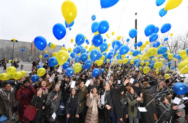 Ballon-Aktion mit Sawsan Chebli vor dem Roten Rathaus - 550 StudentInnen und WissenschaftlerInnen aus Deutschland und den USA setzen Zeichen für Völkerverständigung