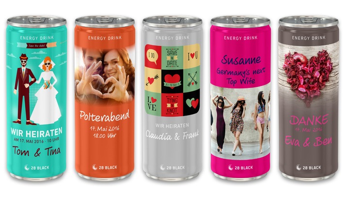 Verliebt, verlobt, verheiratet: Der Sommer steht vor der Tür und damit startet auch die Hochzeitssaison. Für alle Paare, die auf der Suche nach ausgefallenen Ideen rund um ihre Hochzeit sind, bietet der Energy Drink 28 BLACK einen ganz besonderen Service. Unter www.your28black.com können Braut und Bräutigam jetzt ihre individuellen Hochzeitsdosen gestalten - angesagt, persönlich und vielseitig einsetzbar.