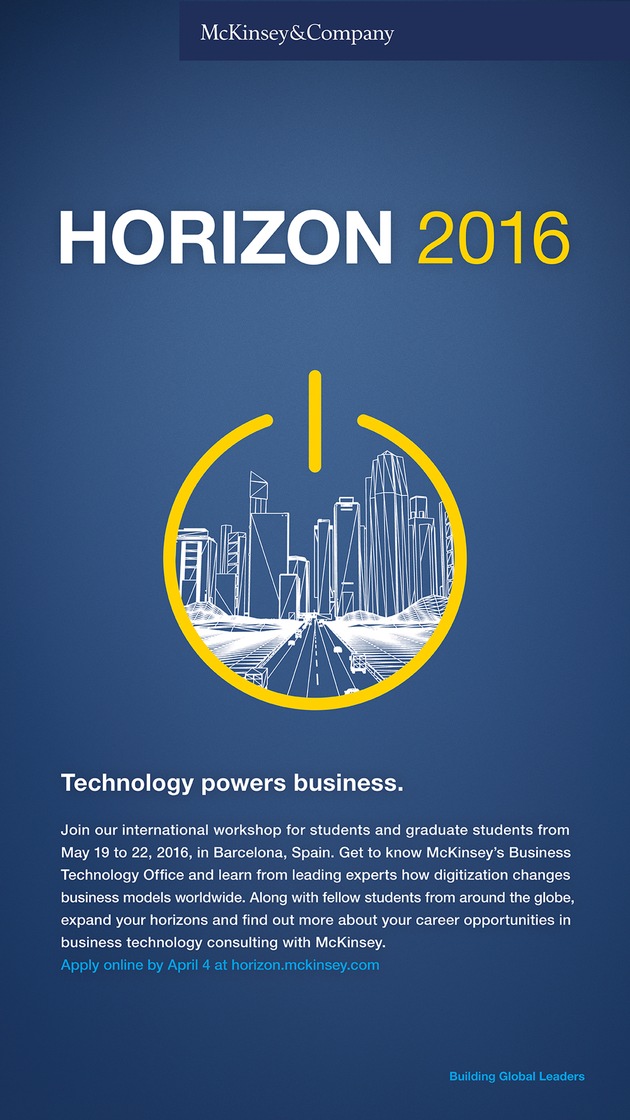 Beim Workshop "Horizon" des Business Technology Office von McKinsey & Company treffen Studierende und Doktoranden aus ganz Europa zusammen, um neue Horizonte an der Schnittstelle zwischen Wirtschaft und IT zu entdecken: In Barcelona entwickeln sie vom 19. bis 22. Mai in internationalen Teams Konzepte und tauchen ein in die Welt der Topmanagement-Beratung. Der Workshop richtet sich an Studierende und Doktoranden der Informatik, Naturwissenschaften, Mathematik, des Ingenieurwesens und der Wirtschaftswissenschaften. Bewerbungen sind ab sofort und noch bis zum 4. April unter www.horizon.mckinsey.com möglich.