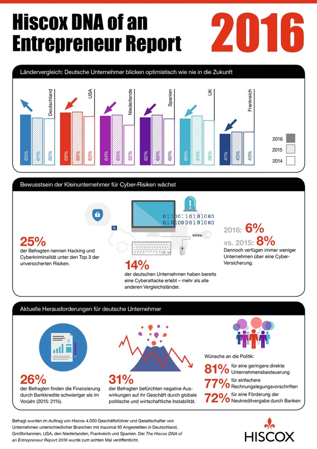 Im Optimismus-Ranking des jährlich erstellten "Hiscox DNA of an Entrepreneur Report 2016" erreicht Deutschland seinen persönlichen Höchstwert seit vier Jahren: 65% der deutschen Kleinunternehmer erwarten in den kommenden zwölf Monaten eine Verbesserung ihrer wirtschaftlichen Lage (2015: 61%; 2014: 60%; 2013: 57%). Im Ländervergleich klettert Deutschland damit von Platz fünf auf den zweiten Platz hinter den USA (68%). Die Aufbruchsstimmung der deutschen KMU hebt sich deutlich von den Befragungsergebnissen der anderen Nationen ab: Im Vergleich zum Vorjahr ist in allen Ländern der Optimismus gesunken - auch beim Spitzenreiter USA (2015: 69%). Im Mittelfeld des Rankings liegen die Niederlande (2016: 64%; 2015: 65%), Spanien (2016: 62%; 2015: 65%) und Großbritannien (2016: 60%; 2015: 64%). Weit abgeschlagen ist Frankreich: Nur 41% der Unternehmer blicken positiv in die Zukunft (2015: 43%).