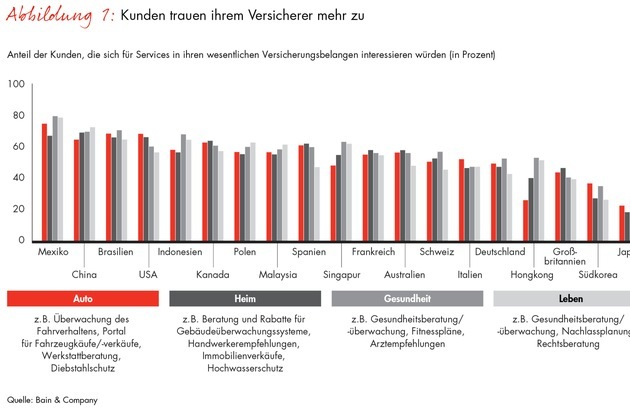 einsNoch lassen Deutschlands Versicherer großes Potenzial ungenutzt. Denn gut die Hälfte der Bundesbürger würde neben Policen weitere Produkte und Dienstleistungen bei ihrer Versicherung kaufen. Das Spektrum reicht vom Pkw bis hin zur Mitgliedschaft in einem Fitnesscenter. Dies ergab die Befragung von 13.000 Kunden großer deutscher Versicherer im Rahmen der weltweiten Studie "Customer Behavior and Loyalty in Insurance" der internationalen Managementberatung Bain & Company mit insgesamt 164.000 Versicherten in 19 Ländern. Dabei ist die Offenheit für zusätzliche Angebote der Versicherer in vielen Ländern noch größer als in Deutschland. Dies gilt vor allem für Schwellenländer wie Mexiko und China, aber auch für die USA oder die Schweiz (Abb. 1). Dr. Christian Kinder, Bain-Partner und Leiter der Versicherungs-Praxisgruppe im deutschsprachigen Raum, sieht darin eine Steilvorlage für die Branche: "Den Versicherern kann mit zusätzlichen Produkten und Dienstleistungen der notwendige Wandel hin zum Lösungsanbieter gelingen." So baut die HUK-Coburg seit Jahren ihr Serviceangebot unter anderem über ihre Vertragswerkstätten systematisch aus. Und auch Generali sowie einzelne AOKs haben digitale Loyalitätskonzepte wie Vitality oder Fitmit gestartet.