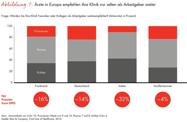 In Deutschland ist der Anteil der Mediziner, die ihre Klinik weiterempfehlen würden, am größten. Hier würde fast jeder zweite Arzt (42 Prozent) zu einer Behandlung in seinem Krankenhaus raten. In Frankreich und Italien dagegen wäre nicht einmal jeder Fünfte dazu bereit. Ähnlich sieht es in puncto Weiterempfehlung der eigenen Klinik als Arbeitgeber aus. In Deutschland und Großbritannien würde dies etwa jeder vierte Arzt tun. In Italien ist nicht einmal jeder zehnte Mediziner von seinem Krankenhaus so überzeugt, dass er es als Arbeitsplatz anraten würde.