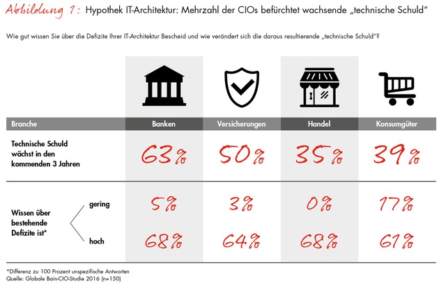 - Bain identifiziert acht Bausteine für eine moderne ITDie IT-Architektur steht für den Erfolg einer jeden Digitalisierungsstrategie. Doch rund um den Globus weist sie bei Banken, Versicherungen, Einzelhandels- und Konsumgüterunternehmen Defizite auf. In der aktuellen CIO-Studie "Mehr Tempo, weniger Altlasten: IT-Architektur im digitalen Zeitalter" der internationalen Managementberatung Bain & Company sehen 63 Prozent der Bankenvertreter in ihrem Unternehmen in den nächsten Jahren die Gefahr einer wachsenden "technischen Schuld". Bei den Versicherern hat jeder zweite CIO diese Befürchtung, im Handel und in der Konsumgüterbranche sind es jeweils knapp 40 Prozent (Abb. 1). Für die Studie befragte Bain weltweit 150 CIOs. In ausführlichen Gesprächen gaben sie Auskunft über ihre vordringlichsten Herausforderungen und Lösungsansätze.