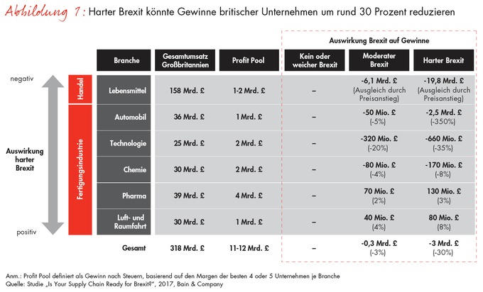 Risiken abfedernDie Spekulationen über die wirtschaftlichen Konsequenzen des Brexit haben die Unternehmen in Großbritannien stark verunsichert. Die Studie "Is Your Supply Chain Ready for Brexit?" der internationalen Managementberatung Bain & Company beleuchtet die Risiken des EU-Austritts. Der britischen Industrie droht im Fall eines harten Brexit, bei dem sich Großbritannien vollständig aus dem gemeinsamen EU-Binnenmarkt verabschiedet, ein Gewinneinbruch von bis zu 30 Prozent.