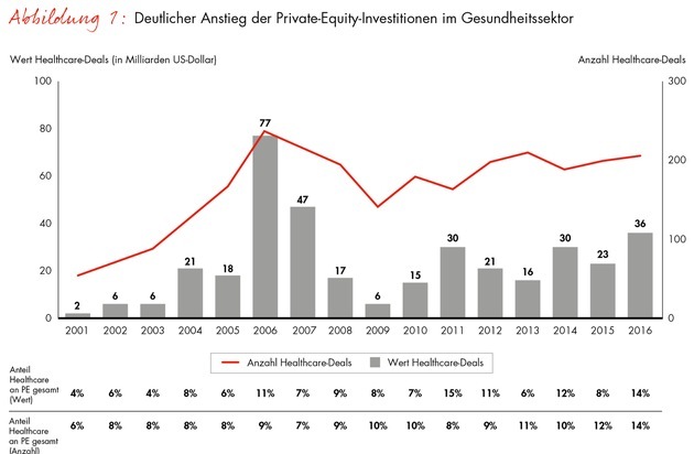 Das erheblich stärkere PE-Engagement in der Gesundheitsbranche stand weltweit im Gegensatz zu der ansonsten vorherrschenden Investitionszurückhaltung. 2016 sank das Volumen neuer Beteiligungen über alle Branchen hinweg um 23 Prozent. Dagegen belief sich der Anteil des Gesundheitssektors am gesamten PE-Investitionsvolumen weltweit auf über 14 Prozent und erreichte damit ein Allzeithoch. Dr. Franz-Robert Klingan, Partner bei Bain & Company und Co-Autor der Studie, erklärt: "Vielen Investoren vermittelt der Gesundheitssektor Sicherheit in turbulenten Zeiten. Denn früher oder später ist nahezu jeder auf Produkte und Services der Gesundheitsbranche angewiesen, unabhängig von Konjunktur und politischen Veränderungen. Deshalb ist auf lange Sicht kaum ein Sektor so attraktiv wie Healthcare."