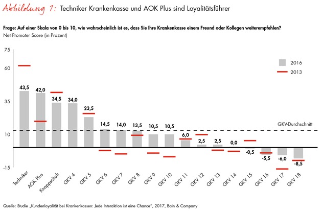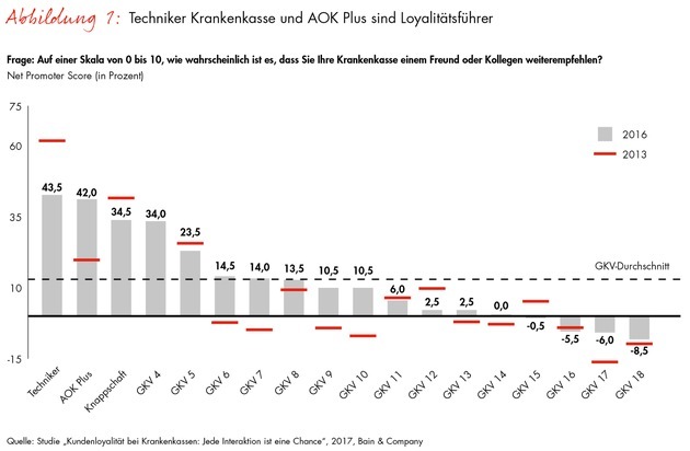 - Versicherer stehen vor drei ParadigmenwechselnUnbeirrt von Diskussionen um Zusatzbeiträge bescheinigen die Deutschen den gesetzlichen Krankenversicherungen gute Arbeit. Das ist das Ergebnis der aktuellen Studie "Kundenloyalität bei Krankenkassen: Jede Interaktion ist eine Chance" der internationalen Managementberatung Bain & Company. Für die Studie hat Bain 3.300 gesetzlich Versicherte bei 18 großen Krankenkassen befragt. Danach legte die mit dem Net Promoter® Score (NPS®) messbare Loyalität in der Branche um 3 Prozentpunkte zu - auf plus 13 Prozent. Die Zahl besonders loyaler Kunden, sprich der Promotoren, überstieg damit deutlich die der Kritiker. Allerdings gibt es teils große Unterschiede zwischen den Anbietern. An der Spitze liegt die Techniker Krankenkasse (TK) mit einem NPS von 43,5 Prozent, trotz Einbußen gegenüber der letzten Studie aus dem Jahr 2013. Danach folgt die AOK Plus, die ihren NPS auf 42 Prozent mehr als verdoppeln konnte. Rang drei belegt die Knappschaft mit 34,5 Prozent (Abb. 1).