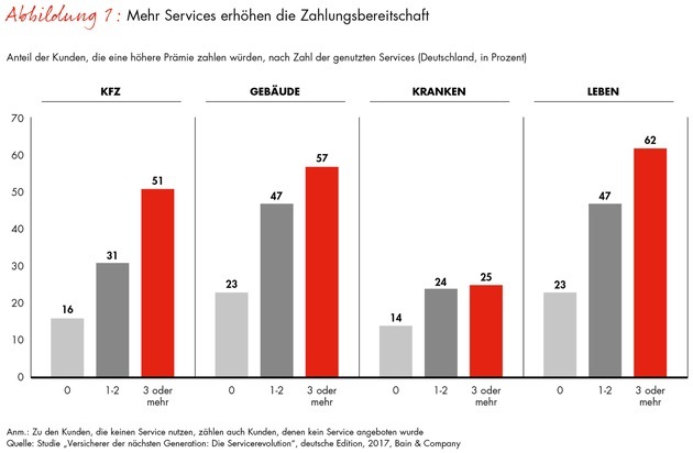 verstärken die KundenloyalitätTelematikservices, Handwerkernetze, Gesundheitsprogramme: Immer mehr Versicherer in Deutschland wie auch in vielen anderen Ländern bieten ihren Kunden Dienstleistungen über die klassische Police hinaus an. Durch den Aufbau ganzer Ökosysteme können sie sich in Zukunft als Lösungsanbieter positionieren und damit die Loyalität ihrer Kunden erhöhen. Das zeigt die Studie "Versicherer der nächsten Generation: Die Servicerevolution" der internationalen Managementberatung Bain & Company, an der 172.000 Kunden aus 20 Ländern beteiligt waren, darunter 15.000 aus Deutschland. Demnach ist in den vier Segmenten Kfz, Gebäude, Kranken und Leben jeweils mehr als die Hälfte der Befragten hierzulande an Ökosystemen interessiert. Zwischen 30 und 40 Prozent würden dafür einen Wechsel ihres Anbieters in Erwägung ziehen. Und bis zu 62 Prozent wären sogar bereit, für diese zusätzlichen Services höhere Prämien zu zahlen (Abb. 1).